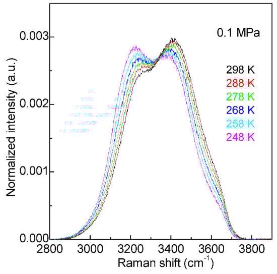 The Raman OH stretching bands of water from 298 to 248 K under 0.1 MPa. Based on normalized intensity, an isosbestic point is found around 3330 cm−1.