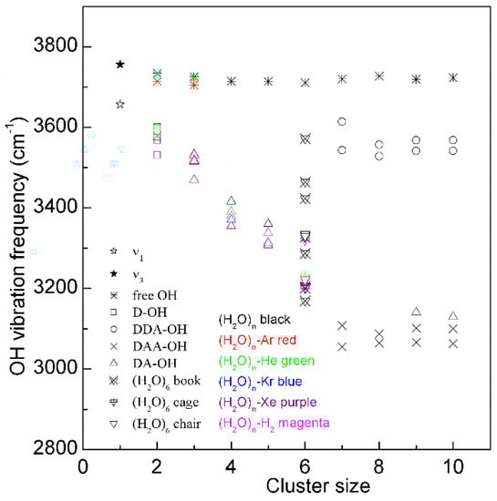 Many works have been conducted to explain the Raman OH stretching band of water. In fact, water molecular clusters, (H2O)n, provide an approach to investigate the dependence of OH vibrational frequencies on hydrogen bondings between water molecules. From the theoretical calculations, the stable configurations of water molecular clusters can be determined. In combination with the experimental measurements on OH vibration frequencies of clusters, these may be utilized to unravel the relationship between OH vibrational frequencies and hydrogen-bonded networks. It is found that, when three-dimensional hydrogen-bonded networks occur in water molecular clusters (n ≥ 6), different OH vibrational frequencies may correspond to various hydrogen bondings in the first shell of a water molecule (local hydrogen bondings), and the effects of hydrogen bondings beyond the first shell on OH vibrational frequencies may be weak (Figure 3). From this, as three-dimensional hydrogen bondings appear, different OH vibrations may be ascribed to OH vibrations engaged into various local hydrogen bondings [30,32].