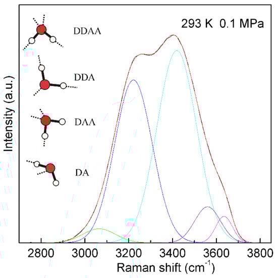 For a water molecule, the local hydrogen-bonded network can be differentiated by whether the molecule forms hydrogen bonds as a proton donor (D), proton acceptor (A), or a combination of both with neighboring molecules. Under ambient conditions, the main local hydrogen bonding motifs for a water molecule can be classified as DDAA (double donor-double acceptor), DDA (double donor-single acceptor), DAA (single donor-double acceptor), and DA (single donor-single acceptor) (Figure 4). For ambient water, the Raman OH stretching band may be fitted into five sub-bands, which can be assigned to the νDAA-OH, νDDAA-OH, νDA-OH, νDDA-OH, and free OH symmetric stretching vibrations, respectively (Figure 4). Therefore, at ambient conditions, different local hydrogen bondings may be expected around a water molecule.