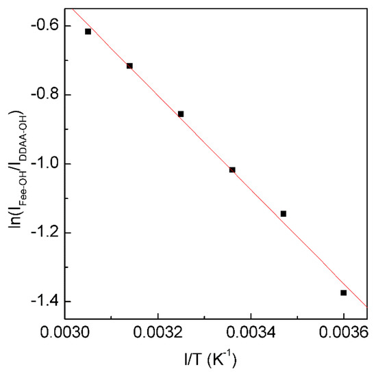 The dependence of ln(IFree-OH/IDDAA-OH) on 1/T. The solid line represents linear fit (R2 = 0.9975) with a slope of −∆H/R. This is used to determine the thermodynamic characteristics of tetrahedral hydrogen bonding.