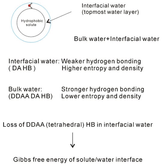 Due to the existence of DDAA (tetrahedral) hydrogen bondings in bulk water, this leads to ΔGWater-water being lower than ΔGSolute-water. In comparison with DA hydrogen bonding, tetrahedral hydrogen-bonded networks own the stronger hydrogen bonding energy, and lower entropy [32]. Regarding the “attractive” force between solutes, it may be ascribed to be an enthalpic process, which is related to DDAA (tetrahedral) hydrogen bondings in bulk water. As the solutes are aggregated in water, they are also accompanied with the loss of entropy, which is related to the transition from interfacial to bulk water (Figure 8). Additionally, hydration free energy is proportional to the surface area of dissolved solutes.