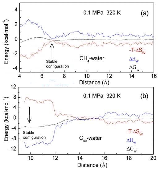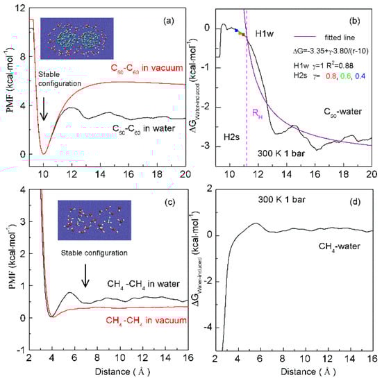The solutes may be “dispersed” or “accumulated” in water, which is related to the size of the solute. As two same sphere solutes are embedded into water, hydration free energy may be related to the separation between them. Therefore, the corresponding Rc is 3.25 Å at 293 K and 0.1 MPa [36]. At ambient conditions, hydrophobic interactions may be expected as the solute radius is larger than 3.25 Å (>3.25 Å). This is demonstrated by our recent MD simulations [36] on two C60 fullerenes in water, and a pair of CH4 molecules in water (Figure 9). Based on the calculated potential mean forces (PMFs), the water-induced contributions may be determined for C60-C60 in water, and CH4-CH4 in water, respectively. It seems that there exists the “attractive” force between two fullerenes (Figure 9). This is due to the radius of C60 fullerene is larger than Rc. Because the CH4 radius is less than 3.25 Å, water molecules are expected to exist in the region between two CH4 molecules. The dissolved CH4 molecules tend to be engaged in the solvent-separated conformation (Figure 9). In other words, as the CH4 molecules are pushed together, this leads to the water molecules between them to be expelled into bulk water, which may be less thermodynamically stable. Therefore, as the CH4 molecules are associated in water, the “repulsive” forces between them may be expected. This is in agreement with the Ashbaugh et al. MD simulations [86].