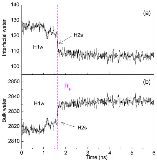 The changes of interfacial (a) and bulk (b) water during two C60 fullerenes are aggregated in solutions. The dashed line represents the corresponding time of RH.