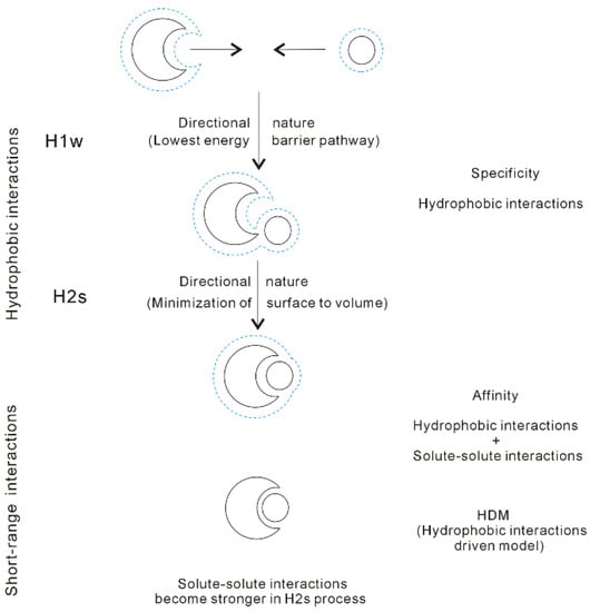 in which rSeparation means the distance between solutes. When the solutes come into contact, the corresponding distance between them is termed ‘the hydrophobic radius’ (RH) [36]. As the solutes are aggregated in water, it may be divided into H1w and H2s hydrophobic solvation processes, respectively (Figure 9).