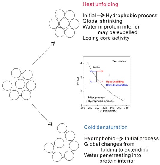 - Sun, Q.; Fu, Y.F.; Wang, W.Q. Temperature effects on hydrophobic interactions: Implications for protein unfolding. Chem. Phys. 2022, 559, 111550. [Google Scholar] [CrossRef]