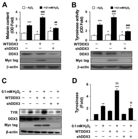 DDX3 induces melanogenesis in H2O2-treated conditions. SK-Mel-2 cells were transiently transfected with shDDX or WTDDX3 for 48 h and then treated with 0.1 mM H2O2 for 4 h before harvesting for melanin content assay (A), tyrosinase assay (B), and Western blot (C). The histogram shows relative expression levels of tyrosinase in H2O2-treated SK-Mel-2 cells with or without DDX (D). The data are presented as the mean ± SEM of 4–6 samples from each group. Data were analyzed using two-way ANOVA followed by multiple comparisons post hoc test. * p < 0.05, ** p < 0.001, *** p < 0.0001 compared to untreated control; ## p < 0.001, ### p < 0.0001 indicate differences compared with H2O2-treated cells after transfection of WTDDX3 or shDDX. $$ p < 0.001 indicates differences compared with H2O2-treated cells after transfection of WTDDX3. & p < 0.05 indicates differences compared with H2O2-treated cells after transfection of shDDX3.