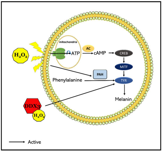 Hydrogen peroxide (H2O2) production due to oxidative stress is associated with apoptosis and melanogenesis in melanocytes [26]. It has been reported that some suppressors such as N-feruloyl serotonin can inhibit H2O2-induced melanogenesis and apoptosis [44]. DDX3 helicase can be a tumor suppressor in many different cancer types. However, the role of DDX3 in melanogenesis has not been reported yet. This is the first report about the involvement of DDX3 in melanogenesis. Results of this study showed that DDX3 upregulated melanogenesis in H2O2-treated SK-Mel-2 human melanoma cells. Our results also suggested that DDX3 might promote melanogenesis in H2O2-treated SK-Mel-2 human melanoma cells by binding to tyrosinase. The identification of DDX3 binding partners indicated the function of DDX3 in melanogenesis and is notably novel for the mechanism regulating pigmentation. DDX3 has been reported to be involved in various biogenesis processes as a potential target for cancer treatment or regulation of apoptosis. Another study has reported that cirsimaritin could stimulate melanogenesis in B16F10 cells and SK-Mel-2 human epidermal melanocytes by upregulating MITF and tyrosinase expression and CREB phosphorylation [45].