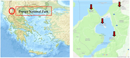 The Prespa Lakes are the highest tectonic lakes in the Balkans, characterized by rare local flora including protected species. There are two lakes separated by a narrow isthmus: Megali (Big) Prespa, which is located on the tripoint of Greece, North Macedonia, and Albania, and Mikri (Small) Prespa, which belongs mainly to Greece (approximately 43.5 sq. km.), while a tiny part (less than 4 sq. km.) to the west belongs to Albania. Both lakes (Big and Small Prespas) are located at altitudes of 852 and 857 m, respectively. The PNP of Greece covers an area of 257 km2 with its main characteristic being habitat diversity. The altitude range, from wetland habitat (altitude 850–853 m) to alpine meadows (altitude over 2000 m), has given rise to a species assemblage that is unique by international standards. Archeological records indicate that Prespa basin has been inhabited for more than six thousand years, while currently, on the Greek side of the region, the lakes are encircled by extensive reedbeds and farmland for the cultivation of beans. In 1975, the Prespa area was designated a “Landscape of Outstanding Natural Beauty”, and, in 2009, 11 smaller areas of the PNP were designated “Protected Natural Formation or Landscape Elements” [16,17]. Regarding the climate of this region, it can be typically characterized as Mediterranean or sub-Mediterranean with strong continental effects, due to its placement in a transitional zone between the Mediterranean climate in the south and continental climate in the north, and also due to the cold and snowy winters of the region and the summer rain seasons. The lands across the basin are characterized by geological diversity, revealing gneiss and granite on the slopes of Mt. Varnous and limestone on the mountains to the west and south side of the lakes [16,17].