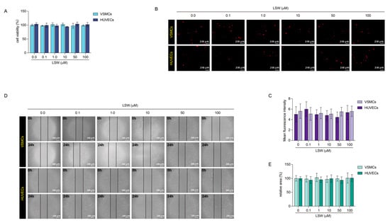 The proliferation and migration of vascular cells are closely responsible for many vascular diseases such as atherosclerosis. Hence, the cck-8 and wound healing assay were performed to test the effects of LSW on the proliferation and migration of VSMCs and HUVECs. Figure 1 showed that the LSW has no effect on proliferation and migration at a gradient concentration from 0.1 to 100 μmol/L. Oxidative stress is the primary adverse reaction of vascular cells responding to external stimuli, which causes a large amount of ROS production and further damages cellular function. Dihydroethidium could be internalized into VSMCs and HUVECs, and intracellular superoxide anions dehydrogenates dihydroethidium to produce ethidium. The ethidium could bind to RNA or DNA to produce red fluorescence. Figure 1B showed no significant change of red fluorescence in the DHE-labeled VSMCs or HUVECs as the concentration of LSW gradually increased. Therefore, the LSW incubation has no effect on the amount of ROS produced within VSMCs and HUVECs. The DHE assay exhibited that LSW was a mild response to oxidative stress in cells (Figure 1B,C). The wound healing assay indicated that the LSW has no specific influence on the migration of HUVECs (Figure 1D,E). Previous studies considered that the LSW as an ACE inhibitor could inhibit the proliferation and migration of Ang II-induced VSMCs, and the data from our lab showed that LSW incubation could revise the anomalous loading of EVs in the Ang II-induced VSMCs [21,22]. Therefore, this result demonstrated that the LSW should be a safe response factor for VSMCs and HUVECs.