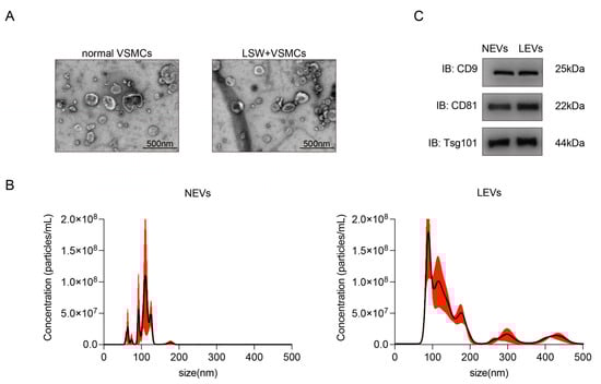 Characterization of extracellular vesicles produced from VSMCs with or without LSW treatment. (A) TEM analysis of EVs from normal VSMCs without LSW treatment (NEVs, left panel) and LSW-treated VSMCs (LEVs, right panel). Scale bar, 500 nm. (B) Particle sizes of NEVs and LEVs, as measured with the NanoSight analysis. (C) The expression of EV-specific markers CD9, CD81, and Tsg101 was measured with western blot analysis.