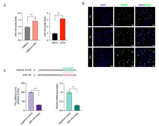 Numerous studies reported that miR-145 is responsible for phenotype modulation of VSMCs and can be transferred by EVs [15]. Hence, the miR-145 loading in EVs was quantified by qRT-PCR. As is shown in Figure 4, LSW incubation increased the expression of miR-145 in both VSMCs and VSMCs-derived EVs, but the different degree of miR-145 expression in EVs was much greater than in cells (Figure 4A). This result implied that the LSW could enhance the load of miR-145 into VSMCs-derived EVs. According to the TargetScan database (version: 7.2, http://www.targetscan.org/vert_72/ (accessed on 16 July 2021)), the PDCD4 might be a target of miR-145. The predicted location of binding is in position 590-597 of PDCD4 3ʹ-UTR (Figure 4C). To test this hypothesis, a dual-luciferase reporter assay was performed in HUVECs. Potential binding sites of miRNA-145 in the 3′-UTR of the PDCD4 mRNA were determined by TargetScan. Firefly luciferase activity was significantly reduced when co-transfected with miRNA-145 mimic, indicating that PDCD4 is a target of miRNA-145 (Figure 4C). Remarkably, the miRNA-145 overexpression caused by miRNA-145 mimic transfection down-regulated the PDCD4 mRNA expressions in HUVECs (Figure 4C). Thus, the uptake of EVs by neural stem cell (NSCs) was visualized by labeling EVs with fluorescent lipid dye PKH67. During 12 h incubation of HUVECs with PKH67-labeled EVs, the fluorescent could be well imaged in the cytoplasm location of HUVECs, indicating the HUVECs could efficiently take in EVs derived from VSMCs (Figure 4B). The above results suggested that the LSW could increase the miRNA-145 load in VSMCs-derived EVs, and the LEVs could internalize into HUVECs and target the PDCD4.