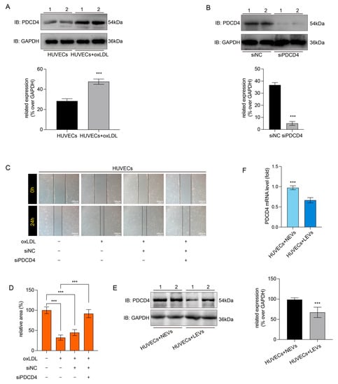 The EVs from LSW-induced VSMCs ameliorate the malignant migration of oxLDL-induced HUVECs by mediating the PDCD4 down-regulation. (A) The oxLDL increased the PDCD4 expression by a western blot analysis. The GAPDH was used as the loading control. The immunoblotting images were represented by densitometry as repetitive bands, *** p < 0.05. (B) The PDCD4 expression in the HUVECs with siRNA-PDCD4 (siPDCD4) or siRNA-negative control (siNC) was detected. The immunoblotting images were represented by densitometry as repetitive bands, *** p < 0.05. (C) The PDCD4 knockout reduced the malignant migration of oxLDL-induced HUVCEs via a wound-healing assay (100× magnification, scale bar: 200 μm). (D) The relative area of the wound healing scratch at 24 h was measured by ImageJ software, and the results of each treatment group were shown to the normal HUVECs without special treatment, *** p < 0.05. (E) The expression of PDCD4 in the HUVECs with NEVs or LEVs incubation. The immunoblotting images were represented by densitometry as repetitive bands, *** p < 0.05. (F) The mRNA expression of PDCD4 in the HUVECs with NEVs or LEVs incubation, *** p < 0.05. Results were presented as mean ± SD, n = 5 for each group.