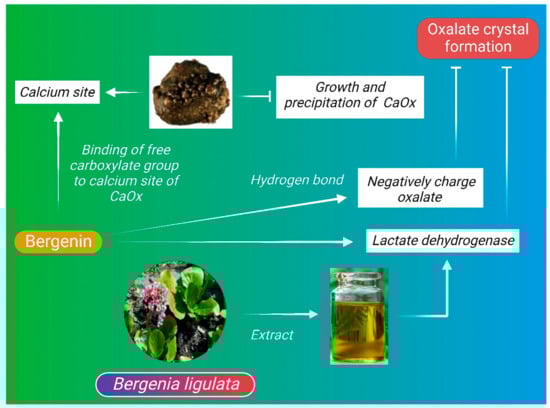 The composition of kidney stones mainly depends on the physiologically and chemically altered urine. Depending on the chemical deposition, kidney stones can be classified as calcium stones—i.e., stones formed due to aggregation of calcium oxalate (CaOx) and calcium phosphate (Ca3(PO4)2) in renal calculi [101]. Other forms of stone include magnesium ammonium phosphate stones; uric acid stones; cystine stones; and drug-induced stones [101]. The general process of stone formation is common for all types of kidney stones. The most common, i.e., the calcium stone formation process, is mainly attributed to the crystallization of calcium oxalate, and the process involves nucleation, crystal development, aggregation, and the retention of crystal in the renal duct [93,101]. The wide range of action of bergenin can be demonstrated by its inhibitory effect on formation of kidney stones. Bergenin is a C-glycoside of 4-O-methyl gallic acid with an ionizing ability in buffer medium under neutral pH, whereas 4-O-methylglycoside (4-OMG) [102], the hydrolysis product of bergenin has negatively charged free carboxylate group, which enables it to bind with the calcium site of CaOx crystals and inhibit the growth and precipitation of CaOx crystals [89]. Similarly, other phenolic groups of B. ligulata such as arbutin and catechin also has the ability to interact with negatively charged oxalate ions by hydrogen bonds, which ultimately modulates the growth of CaOx crystals. Treatment with B. ligulata extract directly reduces the activity of lactate dehydrogenase (Figure 2), which is required for the formation of oxalate crystals in kidney [89].