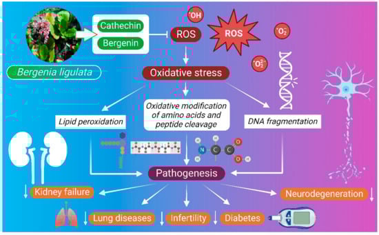 Antioxidative mechanism of B. ligulata. Bergenin has been attributed to the free radical scavenging capacity against hydroxyl radicals through the formation of aromatic conjugated dienes and Fe (II) complex, which ultimately block the generation of hydroxyl radicals. One of the compounds of B. ligulata, 11-O-galloylbergenin, has a special structural orientation due to the presence of two meta and one para group, which induces free radical scavenging by the herb. ROS—reactive oxygen species.