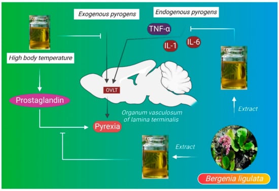 Pyrexia is defined as the abnormal elevation of body temperature, where external temperature is more than 38 °C or internal temperature is above 38.4 °C [106]. In the case of pyrogenic pyrexia, the generation of fever involves several mechanisms, most commonly exogenous pyrogens such as microbes or endogenous pyrogens such as interleukin 1 (IL-1) or interleukin 6 (IL-6). TNF-α interacts with organum vasculosum of the lamina terminalis (OVLT), leading to the development of pyrexia. On the contrary, most autoinflammatory conditions are genetic and also related to malfunctioning of pro-inflammatory cytokines such as interlukin-1 or interferon signaling or constitutive NF-kB (nuclear factor kappa-light-chain-enhancer of activated B cells) activation, which are the most potent targets for the management of pyrexia [107]. In pyrexic conditions, there is an increase in prostaglandins (PGE2), which control the thermoregulatory center in the hypothalamus. Some antipyretic drugs introduce their antipyretic activity by blocking prostaglandin biosynthesis [108]. B. ligulata has antipyretic properties, particularly ethanolic root and rhizome extracts of the plant contain steroids, alkaloids, flavonoids, and terpenoids, which may block the activity of pyrogens on temperature-sensitive neurons in the preoptic part of the hypothalamus [17]. However, more detailed study is needed to reveal the bioactive molecules that are responsible for the antipyretic property (Figure 4).