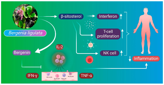 Inflammation is a response of the immune system to foreign substances and injuries, which is essential for tissue homeostasis under different noxious conditions [112]. Beta-sitosterol is an important constituent isolated from B. ligulata extract that possesses anti-inflammatory properties. Beta-sitosterol directly induces the proliferation rate of T cells and releases interferon and increases natural killer cell activity as well. Anti-inflammatory properties of the B. ligulata plant may also be attributed to the synergistic effect of pro-inflammatory enzyme inhibitors that are responsible for the reduction in inflammatory response [6]. Bergenin also inhibits the formation of proinflammatory cytokines such as IL-2, interferon gamma (INF-ɣ), and TNF–α [45]. It also shows anti-microbial properties by inhibiting the growth of microbes in both in vivo and in vitro (Figure 6); however, the exact mechanism of action is yet unknown [37].