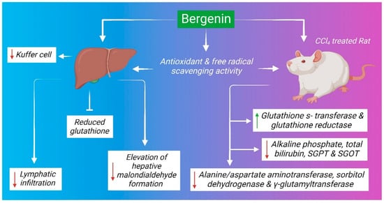 Several studies have demonstrated the hepatoprotective activity of B. ligulata, although the mechanism of action is poorly understood. The antioxidant properties and cellular restoration capacity of the plant may play significant roles in the recovery of damaged liver tissues. Free radicals such as hydroxyl radicals, hydrogen peroxide, superoxide radicals, and lipid peroxide are predominant in liver diseases. These free radicals are normally generated during the biochemical process of the body or due to exposure to different environmental toxicants or pathological states [113]. Excess amounts of free radicals generate oxidative stress that alters the membrane structure and damage other important components of the cell including lipids, proteins, and nucleic acids [114]. The bioactive compounds of B. ligulata may exert hepatoprotective activity (Figure 7) through antioxidant and free-radical scavenging properties. Similarly, it can normalize increased Kuffer cells number and lymphocytic infiltration in infected mice [19]. In Wistar albino rats, B. ligulata root extract ameliorated carbon tetrachloride (CCl4)-induced liver damage along with a reduction in the level of alkaline phosphatase (ALP), total bilirubin level, SGPT, and SGOT [95]. The major bioactive component of B. ligulata, i.e., bergenin, might be responsible for the hepatoprotective properties of the plant. Bergenin at doses of 50, 100, and 200 mg/kg body weight showed a strong hepatoprotective effect when administrated orally for 7 successive days in CCl4-induced liver damage in rats. The administration of bergenin subsequently normalizes the increasing serum enzymatic activities of alanine/aspartate aminotransferase, sorbitol dehydrogenase, and γ-glutamyltransferase in CCl4-treated rats in a dose-dependent manner. In contrast, the recuperation of the activities of glutathione S-transferase and glutathione reductase was also reported. Additionally, bergenin can prevent the elevation of hepatic malondialdehyde formation and the depletion of reduced glutathione content in the liver of CCl4-intoxicated rats [115,116].