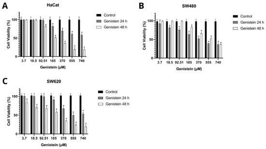Effect of genistein on cell viability after 24 h and 48 h of treatment compared to the control (A) non-malignant HaCaT cell line, (B) SW480 colorectal adenocarcinoma cell line, and (C) SW620 colorectal adenocarcinoma cell line. All tests were performed in quintuplicate. p-value < 0.05 *.
