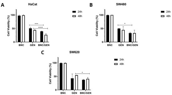 Cell viability of empty BNC capsules and BNC/GEN capsules, taking into account the IC50 value of free genistein, after 24 and 48 h (A) non-malignant HaCaT cell line, (B) SW480 colorectal adenocarcinoma cell line, and (C) SW620 colorectal adenocarcinoma cell line. p-value < 0.05 *; p < 0.001 ***; and p < 0.0001 ****.