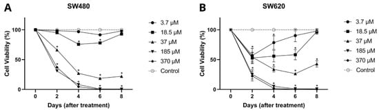 In Figure 5, it can be seen that genistein showed an antiproliferative effect throughout the evaluated times in a dose-dependent manner for both cell lines SW480 and SW620. In SW480 cells, genistein induced an inhibitory effect on viability from day 2 of treatment with high concentrations of the compound (37, 185, and 370 µM), while for days 4 and 6, this effect was observed at low concentrations (from 18.5 µM). Similar results were observed in the metastatic cell line (SW620), in which genistein was found to have a significant effect on cell viability on days 2 and 4 at all concentrations tested (3.7–379 µM). While for day 6, concentrations higher than 18.5 µM were required and for day 8, concentrations higher than 37 µM, concluding that the antiproliferative effect of genistein is conditioned by the dose and treatment time in these cell models. These results again demonstrate that there is a greater effect of genistein when the dose and exposure time to the compound are increased.