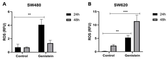 Effect of genistein on the production of reactive oxygen species (ROS) after treatment with genistein in two periods of time (24 h and 48 h). (A) SW480 cell line and (B) SW620 cell line. All tests were performed in triplicate. RFU: Relative Fluorescence Units. p-value < 0.01 **; and p < 0.001 ***.