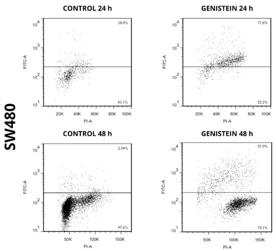 Genistein induces cell death in SW480 cell line. Dot plot of PI/FITC in SW480 cell line after treatment with genistein in two periods of time (24 h and 48 h).
