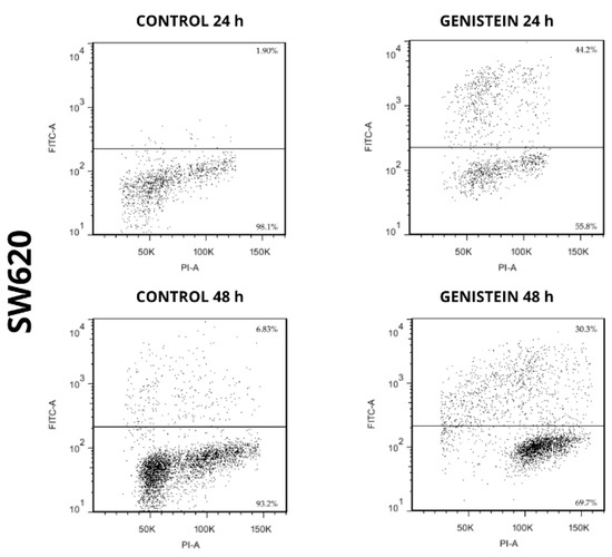 Genistein induces cell death in SW620 cell line. Dot plot of PI/FITC in SW620 cell line after treatment with genistein in two periods of time (24 h and 48 h).