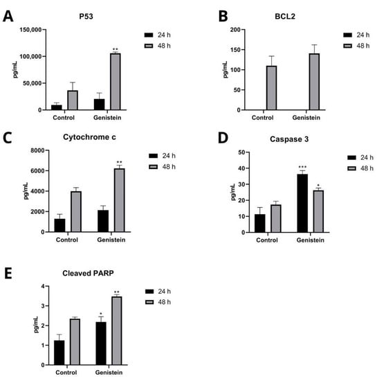 Effect of genistein on intracellular proteins that participate in the apoptosis process in SW620 cell line. Levels of each protein after treatment with genistein in two periods of time (24 h and 48 h) compared to the control. (A) p53. (B) BCL2. (C) Cytochrome c. (D) Caspase 3. (E) Cleaved PARP. p < 0.05 *; p < 0.01 **; and p < 0.001 ***.