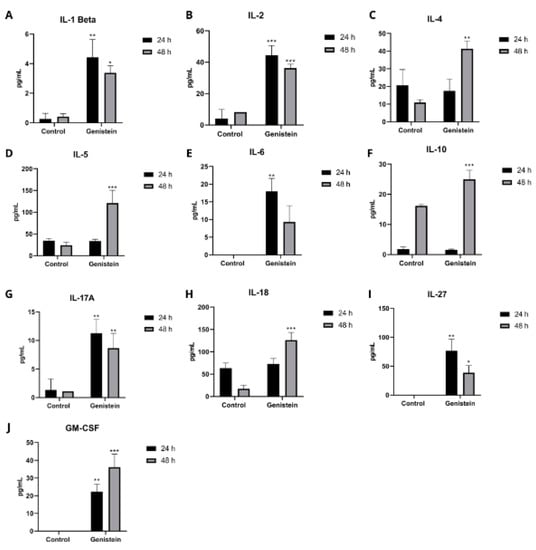 On the other hand, in the SW620 cell line, several cytokines showed a significant increase both at 24 h and 48 h after genistein treatment (Figure 10). At 24 h, a significant increase over the control was observed after treatment in the cytokines IL-1B, IL-2, IL-6, IL-13, IL-17A, IL-27, and GM-CSF. For 48 h of treatment, a significant increase in the cytokines IL-1B, IL-2, IL-4, IL-5, IL-10, IL-17A, IL-18, IL-27, and GM-CSF was observed. The other cytokines did not show significant differences from the control in this cell line (results not shown).