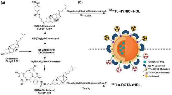 Schematic methodology for the preparation of a suitable platform for theranostic applications. (a) Synthesis of cholesterol derivatives; (b) HYNIC-rHDL or DOTA-rHDL nanoparticles radiolabeled with 99mTc and 177Lu.