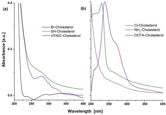 UV-Vis spectra of (a) HYNIC-S-(CH2)3-S-Cholesterol (HYNIC-Cholesterol) and its Br- and SH- precursors and (b) DOTA-benzene-p-SC-NH-(CH2)3-NH-Cholesterol (DOTA-Cholesterol) and its Cl- and NH2- precursors.
