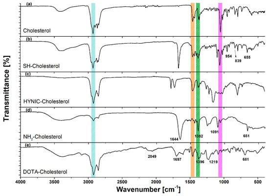 In the IR spectrum of SH-(CH2)3-SH-Cholesterol (SH-Cholesterol) (Figure 3), the band at 835 cm−1 corresponds to (S-H)δ and the band at 630 cm−1 corresponds to stretching (C-S)υ, while the (C-Br)υ band disappeared. The spectrum of NH2-(CH2)2-NH-Cholesterol (NH2-Cholesterol) (Figure 3) showed a broad band at 3400–3500 cm−1, which characterizes the presence of a primary amine (NH2)st; the disappearance of the vibration associated with the chloroalkane (CCl)δ was also observed, from which it was inferred that the chlorine was substituted. The spectrum of DOTA-Cholesterol showed common bands (although shifted) with regard to the DOTA-benzene-p-SCN spectrum.