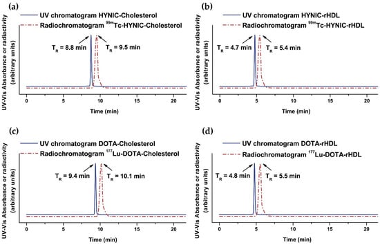 Size-exclusion HPLC chromatogram (254 nm; blue continuous line) of (a) HYNIC-Cholesterol, (b) HYNIC-rHDL nanoparticles, (c) DOTA-Cholesterol, and (d) DOTA-rHDL nanoparticles. Size-exclusion HPLC radiochromatogram (red dotted line) of (a) 99mTc-HYNIC-Cholesterol, (b) 99mTc-HYNIC-rHDL nanoparticles, (c) 177Lu-DOTA-Cholesterol, and (d) 177Lu-DOTA-rHDL nanoparticles. Protein-Pak 300SW column, 0.1 M phosphate buffer (pH 7.4), flow rate 1.0 mL/min.