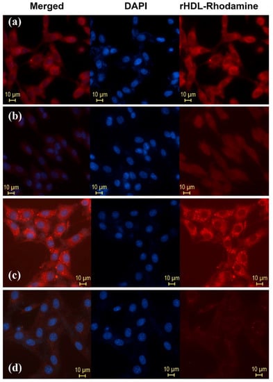 Internalization in T47D cells (SR-B1+) (release to cytosol) of Rhodamine 6G used as cargo in (a) HYNIC-rHDL nanoparticles, (b) HYNIC-rHDL nanoparticles with SR-B1 receptor blocking effect (T47D cells pretreated with 200 μL of Apo-A1, 1 mg/mL, in the form of empty rHDL), (c) DOTA-rHDL nanoparticles, and (d) DOTA-rHDL nanoparticles with SR-B1 receptor blocking effect (T47D cells pretreated with 200 μL of Apo-A1, 1 mg/mL, in the form of empty rHDL). Observe the intensity of Rhodamine fluorescence when it is internalized in TD47 cells due to its release from the rHDL core to the cytosol after the specific interaction of Apo-A1 (present on the surface of the rHDL nanoparticle) with SR-B1 (highly expressed on the surface of TD47 cancer cells).