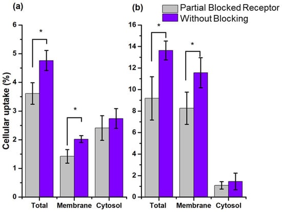 Cellular uptake and internalization (cytosol accumulation) (% of total activity) of (a) 99mTc-HYNIC-Cholesterol and (b) 177Lu-DOTA-Cholesterol in PC3 with blocked and unblocked SR-B1. Blocking of SR-B1 was performed with 7 mg/mL of empty rHDLs. * Statistically significant difference (p < 0.05).