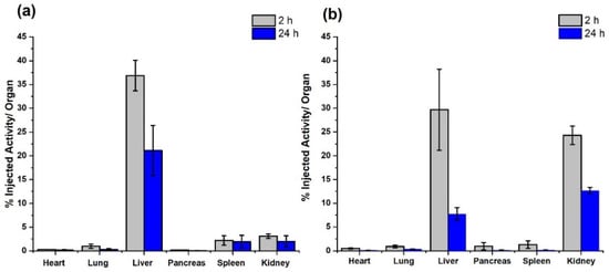 Biodistribution profile in mice (% injected activity/organ) of (a) HYNIC-rHDL and (b) DOTA-rHDL nanoparticles after 2 and 24 h of administration.