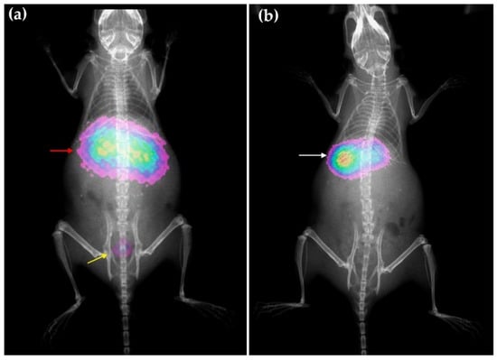 Molecular imaging obtained in mice at 2 h after intravenous administration of rHDL nanosystems, (a) optical image (Cerenkov/X-ray image) for 177LuDOTA-rHDL and (b) radioisotopic/X-ray image for 99mTc-HYNIC-rHDL. Observe the overlapping of liver and kidney (red arrow) as a consequence of the 177Lu-DOTA-rHDL uptake in both organs, as well as the radiotracer elimination through the bladder (yellow arrow); 99mTc-HYNIC-rHDL showed mainly liver uptake (white arrow).