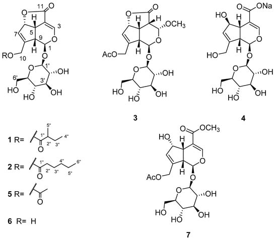 Known compounds were characterized as asperuloside (5) [27], deacetylasperuloside (6) [32,33], and daphylloside (7) [34] by their NMR and mass spectral data analysis, which also matched reported values.
