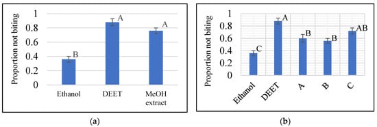 (a) Values of proportion not biting of methanolic extract and (b) subfractions of Stenaria nigricans and DEET against Aedes aegypti. The extract and subfractions were tested at 10 µg/cm2. DEET at 25 nmol/cm2 was used at a positive control and ethanol was used as a solvent control. Means within each group followed by the same letter are not significantly different (Ryan-Einot-Gabriel-Welsch multiple range test (p ≤ 0.05).