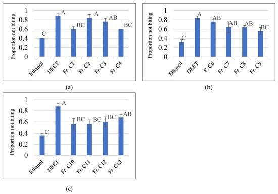 Proportion not biting values of fractions of methanolic extract part C of Stenaria nigricans and DEET against Aedes aegypti. Subfigures (a–c) represent data of fractions 1–4, 6–9 and 10–13, repectively. Ethanol was used as a solvent control. The fractions were tested at 10 µg/cm2. DEET at 25 nmol/cm2 was used as a positive control. Means within the bars in each group followed by the same letter are significantly different (Ryan-Einot-Gabriel-Welsch multiple range test (p ≤ 0.05).