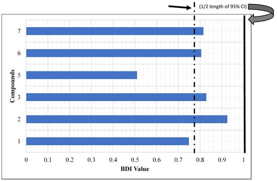 Methanolic crude extract of S. nigricans aerial parts at 10 µg/cm2 showed biting deterrence similar to DEET at 25 nmol/cm2 in K & D bioassay (Figure 2a). To follow the activity, the methanolic crude extract was fractionated by vacuum liquid chromatography (VLC) over silica gel with chloroform, ethyl acetate, and methanol to yield three respective subfractions (A–C), which were tested for their biting deterrent activity (Figure 2b). Fraction C, which showed biting deterrence similar to DEET (Figure 2b), was further fractionated by silica gel column chromatography (CC) into 13 fractions (C1–C13). Fraction C4 turned out to be pure compound 1. Except for Fr. C5 (insufficient amount), the other 12 fractions (C1–C4 and C6–C13) were tested for their biting deterrence against Ae. aegypti females (Figure 3). Frs. C2, C3, C6, C7, C8, and C13 at 10 µg/cm2 showed biting deterrence activity similar to DEET (Figure 3). Subsequently, the bioactive fractions were subjected to chromatographic techniques to find the active principles that resulted in the purification of compounds 2–7. The purified compounds were characterized by spectroscopic and spectrometric techniques (1D- and 2D-NMR and HRESIMS). Compounds 1–3 and 5–7 were tested for their biting deterrent activity at 25 nmol/cm2. Based on BDI values, compounds 2, 3, 6, and 7 showed biting deterrence similar to DEET (Figure 4) and have the potential to be used as repellents against mosquitoes. In an in vitro digging bioassay, none of these compounds showed any repellency against hybrid imported fire ants at a dose of 125 µg/g. This is the first report of biting deterrence and repellency of S. nigricans extract and its pure compounds, iridoid glucosides, against mosquitoes and imported fire ants. Further studies should be conducted to explore the repellent potential of these compounds in different formulations under field conditions.