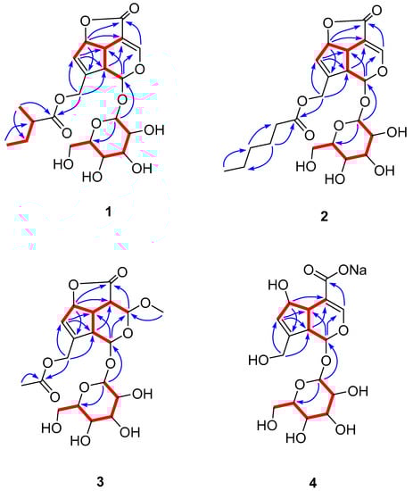 Bold bonds (▬) represent COSY couplings and curved arrows (→) indicate key HMBC correlations of compounds 1–4.
