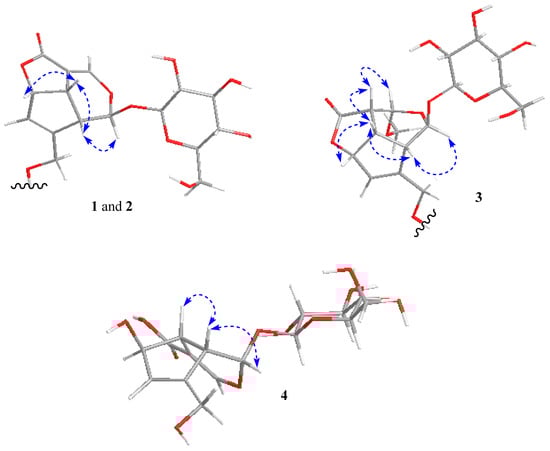 Dotted double-head arrows represent selected NOESY correlations of compounds 1–4.