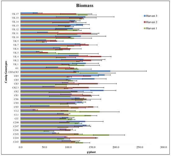 Previous studies on CR3 and CR9 have shown that those cultivars present biomass productivity that is superior to other commercial genotypes [33,34]. Our results show that plants that originated from the crossing of CR3 and CR9 inherit their biomass accumulations, a significant trait that can be exploited commercially. The variations observed on biomass accumulation on the genotypes, reinforce the necessity of further studies on catnip germplasm with quantitative and qualitative focuses (i.e., total productivity and chemical composition) and those studies should be standardized in terms of seasonality as it profoundly influences primary and secondary metabolites accumulation [35,36].