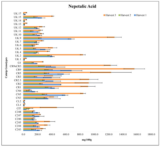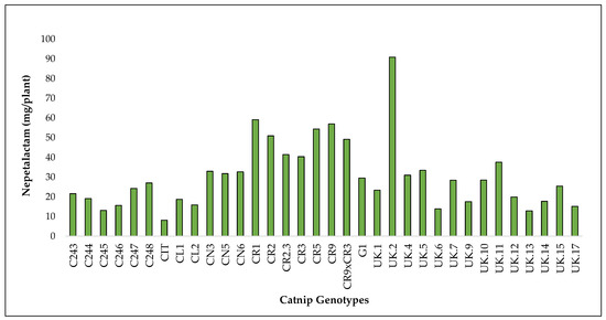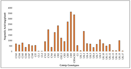 The average yield of nepetalactam (NT) was much lower compared to that of nepetalic acid (NA). Genotype UK.2 had the highest content of NT at 25.5 mg/100 g, followed by the CR genotypes with CR9 and CR1 having the second highest amount at 19.1 mg/100 g followed by CR5, CR2.3, CR2, and CR3 ranging from 13.9 mg/100 g–16.9 mg/100 g. The commercial genotype CIT had the lowest content of NT at 2.8 mg/100 g (Table 2).