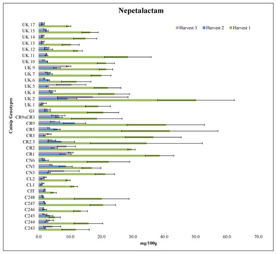 In 2017 harvest 2 and 2018, the genotypes did not differ statistically regarding nepetalactam content (Figure 3, Table S3). The CR genotypes (CR1, CR2, CR2.3M CR3, CR5, CR9, CR9 × CR3) and the CN genotypes (CN5 and CN6), had the highest values of NT in 2017 harvest 1 when comparing each genotype individually across all 3 harvests (Figure 3, Table S3).