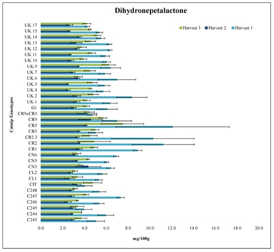 For dihydronepetalactone (DHNL), in harvest 1 of 2017, CR5, CR2 and CR2.3 had the highest values, all statistically equal, ranging from 10.3 mg/100 g–12.1 mg/100 g, followed by CR1 (8.9 mg/100 g) and UK.2 (8.3 mg/100 g). The other genotypes showed the lowest values, not statistically different from each other for harvest 2017-1. For harvests 2017-2 and 2018, no statistical difference was observed among genotypes for DHNL (Figure 4, Table S4).