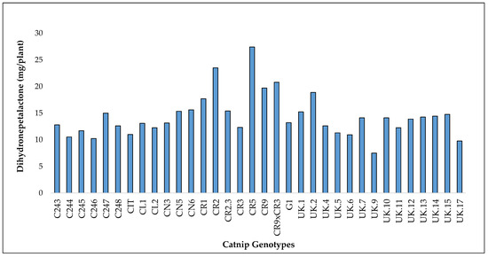 In 2017, UK.9 had the lowest Dihydronepetalactone (DHNL) content at 4.2 mg/plant while CR5 had the highest at 15.8 mg/plant. In 2018, CL2 had the lowest DHNL at 1.0 mg/plant while CR5 had the highest DHNL at 11.6 mg/plant. (Figure 8, Table S5).
