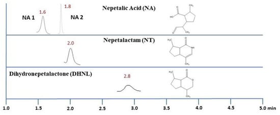 For the QqQ-MS/MS parameters, high purity nitrogen was used as the nebulizing, sheath and drying gas. The drying gas was set at 300 °C with a flow rate of 13 L/min, the nebulizer at 50 psi and the sheath gas at 250 °C with a flow rate of 12 L/min. The capillary voltage was 3000 V and nozzle voltage was set at 1500 V. Delta EMV was zero. Multiple reaction Monitoring mode (MRM) was used as scanning mode with parameters shown in Table 5. Representative chromatograms of nepetalic acid (NA), nepetalactam (NT) and dihydronepetalactone (DHNL) along with their chemical structures are presented in Figure 9.