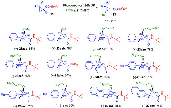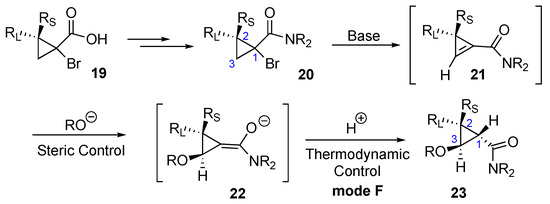 Attempts to extend this methodology beyond the trisubstituted cyclopropane substrates greatly amplify the challenge of controlling the stereoselectivity of the addition. Indeed, all the modes discussed above require the control of a single center only, since the two forming chiral centers are linked to each other. In 2013, we communicated on the realization of a more advanced strategy, involving two modes of diastereoselctivity control providing tetrasubstituted cyclopropyl ethers 23 (mode F, Scheme 2) [67]. The proof of concept of such a strategy was showcased on racemic bromocyclorporpanes 20. We also demonstrated employing racemic substrates, i.e., that the relative configuration of the center at C-3 can be efficiently controlled by steric environment employing appropriate substituents RS, RL; thus, control of this step is related to mode B. Finally, relative configuration at C-1 was installed via the base-assisted epimerization of this center, in a process identical to the one, previously used in mode A (Scheme 2) [66,67]. We reasoned that the absolute configuration of the quaternary stereogenic center at C-2 in chiral non-racemic amide 20 would be preserved during the dehydrohalogenation/nucleophilic addition sequence, which can be used to access to enantiomerically enriched compounds 23.